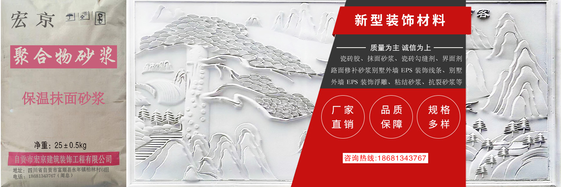 自貢市宏京建筑裝飾工程有限公司,成立于 2018 年,廠房位于位于四川省自貢市富順縣永年鎮(zhèn)柏林村 6 組柏林村小。本公司集保溫材料聚合物改性水泥基砂漿材料研發(fā)、生產(chǎn)、銷售于一體的干粉砂漿材料公司。 公司基于低碳、環(huán)保、綠色、節(jié)能的經(jīng)營理念,生產(chǎn)推廣高效、節(jié)能、環(huán)保的新型保溫材料等產(chǎn)品。本公司 產(chǎn)品具有質(zhì)量優(yōu)良、良好技術(shù)、精湛工藝、成本低等優(yōu)勢。公司成立以來,一直視產(chǎn)品質(zhì)量為企業(yè)的生命, 堅持“質(zhì)量為先,顧客至上”的服務(wù)宗旨,贏得了客戶的信賴,并建立了完善的售前售后服務(wù)體系,歡迎各 界來